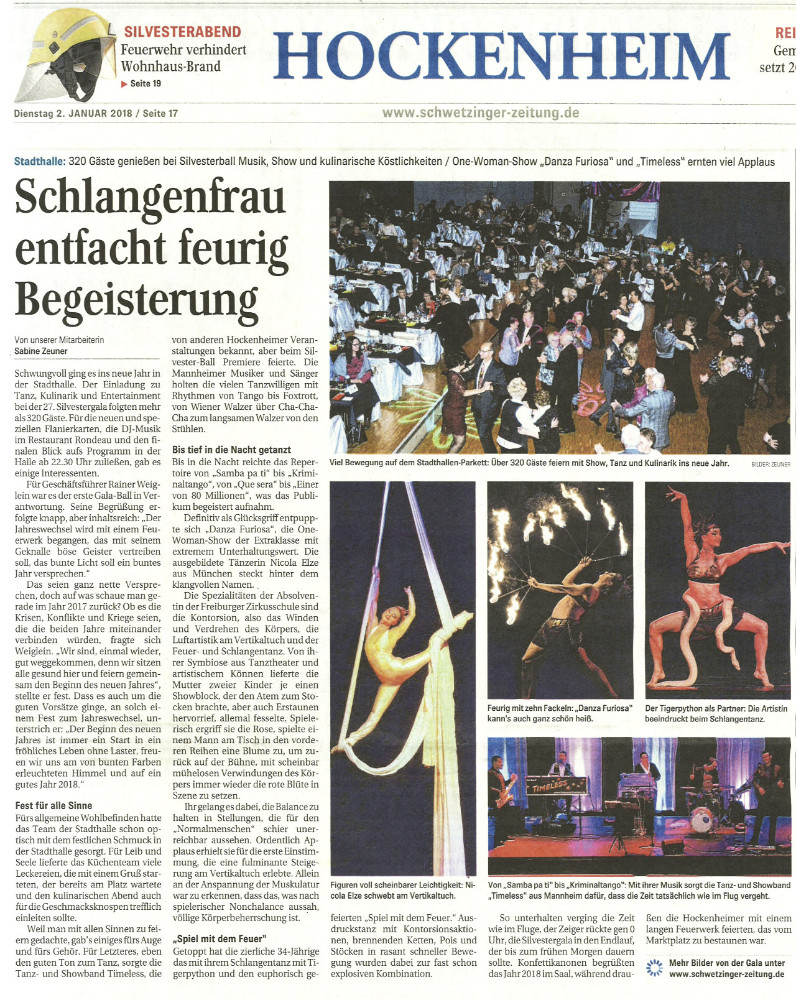 Der fundiert klassisch wie auch modern ausgebildeten Choreographin und Tänzerin Nicola Elze gelingt mit DANZA FURIOSA eine einmalige wie atemberaubende Fusion aus artistischem Können und modernem Tanztheater auf allerhöchstem Unterhaltungsniveau.