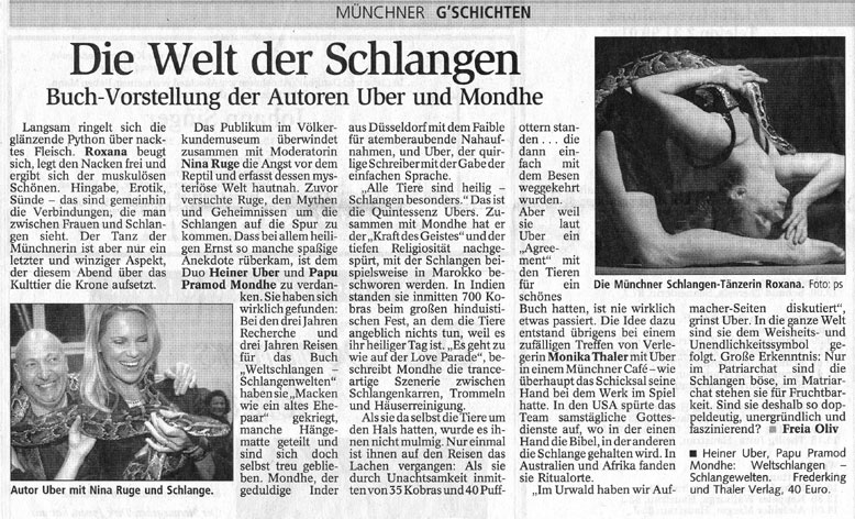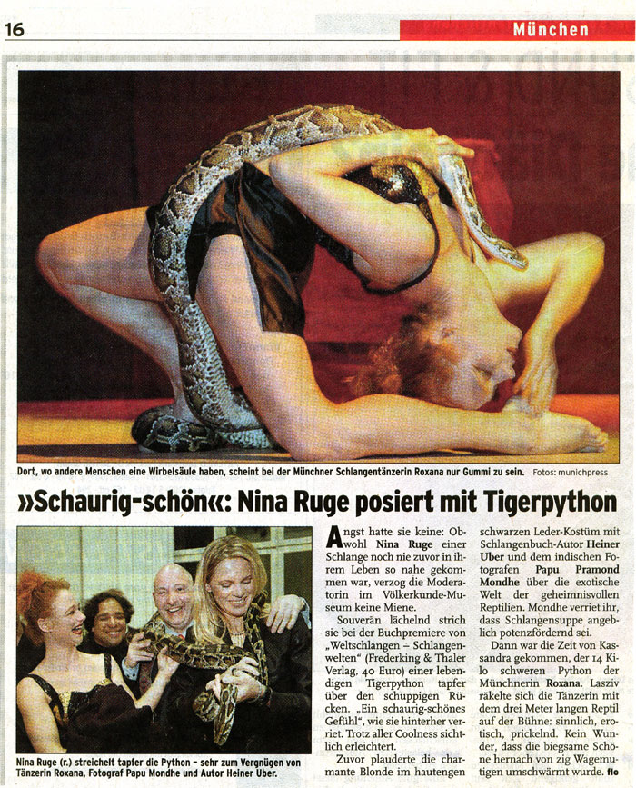 Am Freitag, 12.April, 19.00 Uhr, sprach Fernsehmoderatorin Nina Ruge mit Autor Uber und Fotograf Mondhe über deren eben erschienenen Bildband, in dem sie unter anderem die Tänzerin Roxana präsentieren. Im Anschluss an das Gespräch trat Roxana mit ihren Tigerpythons Kassiopeia und Kassandra auf. Sie biegt und windet sich wie einst die Priesterinnen der altägyptischen Schlangenheiligtümer. Für christliche Europäer hat die Performance auch etwas verruchtes, schlüpfte doch Satan selbst in die Haut der Schlange, als er Eva verführte. Pfui Teufel eben. Bildunterschrift: Verteufelt sinnlich – Roxana bei ihrem Tanz mit Kassandra und Kassiopeia.